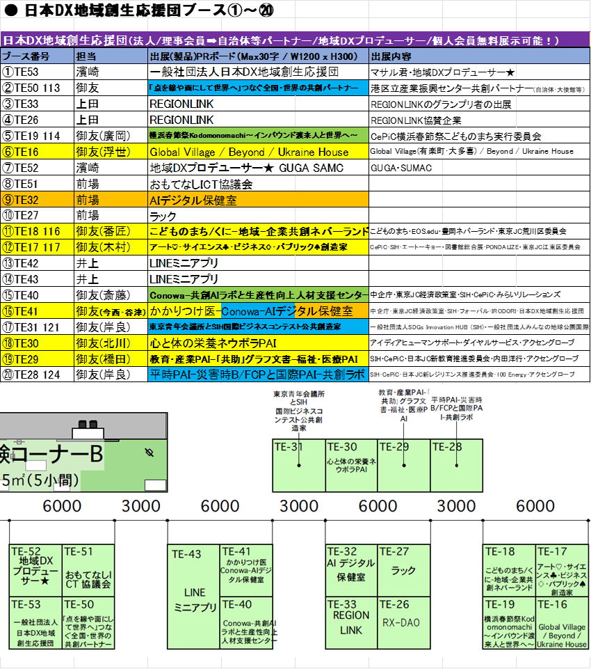 ・主催/協賛・登壇等団体理事会員・法人会員・自治体等パートナー・個人会員(次世代のこども・若者から産官学民の大人まで)・地域DXプロデューサーなどがブース出展(下記2026/1/8-10のTOKYO DIGICONX出展ブースをテーブル半分のスペースに出展から)